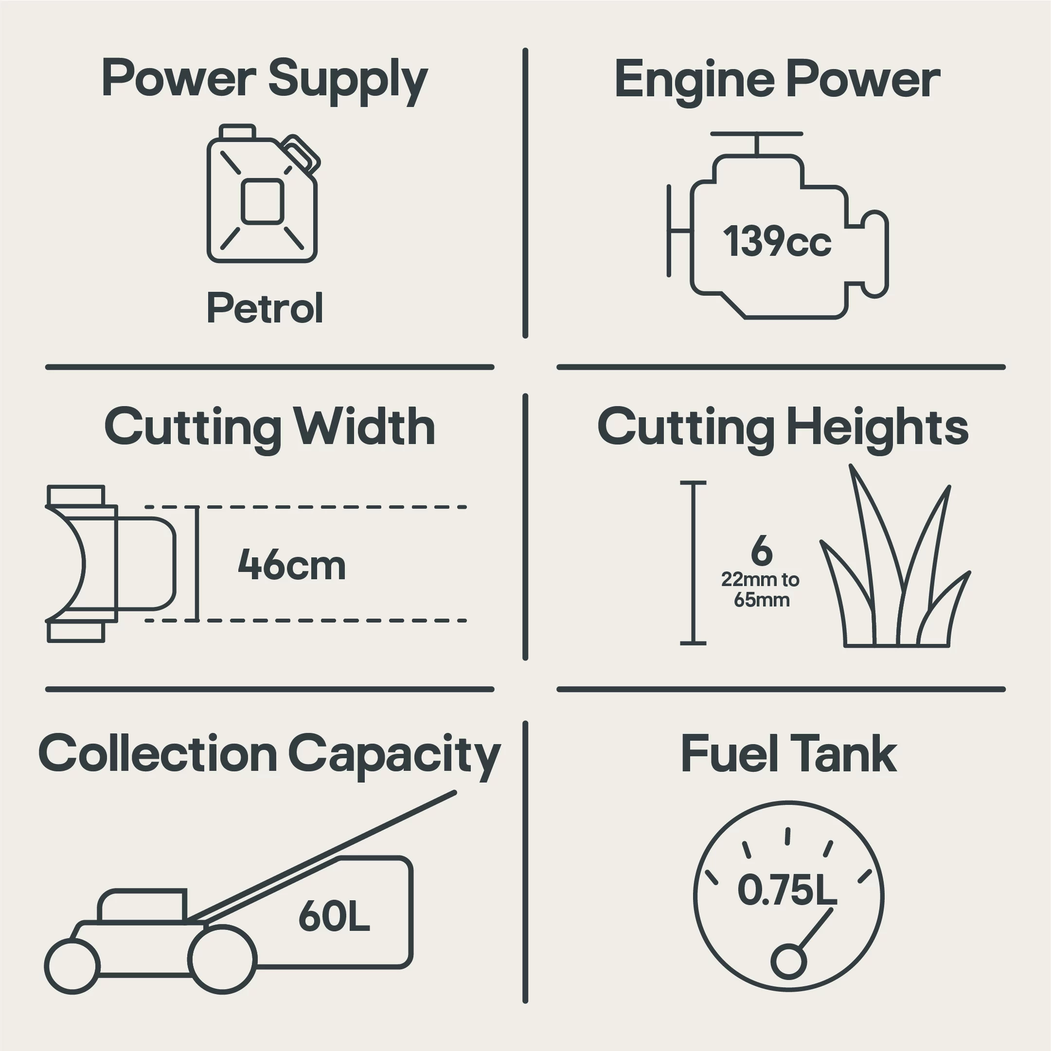- Rugged powder coated and hard wearing steel chassis with 46cm cutting width